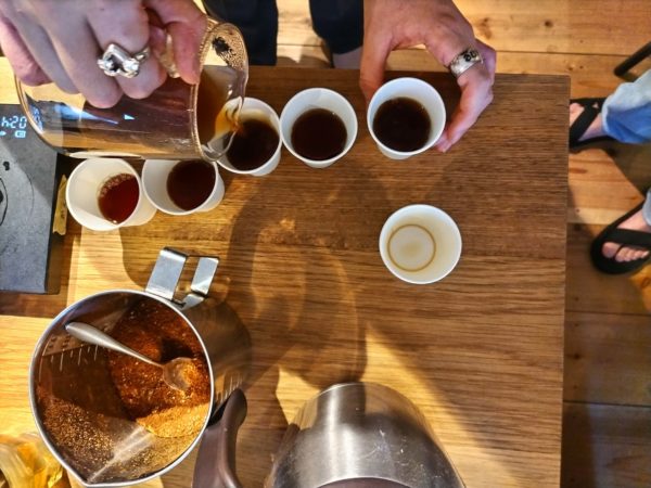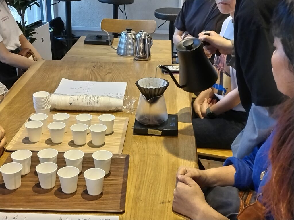 参加者は、自分の手で豆を挽くところからスタート。 ガリガリとミルを回す音、ふわっと広がる香りに、自然と表情がほころびます。 お湯を注ぐと、ふくらむ粉から立ち上る蒸気が視界を柔らかく包み込み、香りと温もりが同時に広がっていきます。