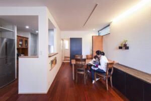 ステンレス製作キッチンのあるLDKを中心配置。廊下を無くし居室との間仕切壁はガラスとしたことで空間 の広がりが生まれ、常に家族間の交流を促す広場を意識し 計画しました。 隣接する住戸との界壁は収納を配置。生活時間の異なる集合住宅のデメリットをメリットに変えた住空間の 提案です。