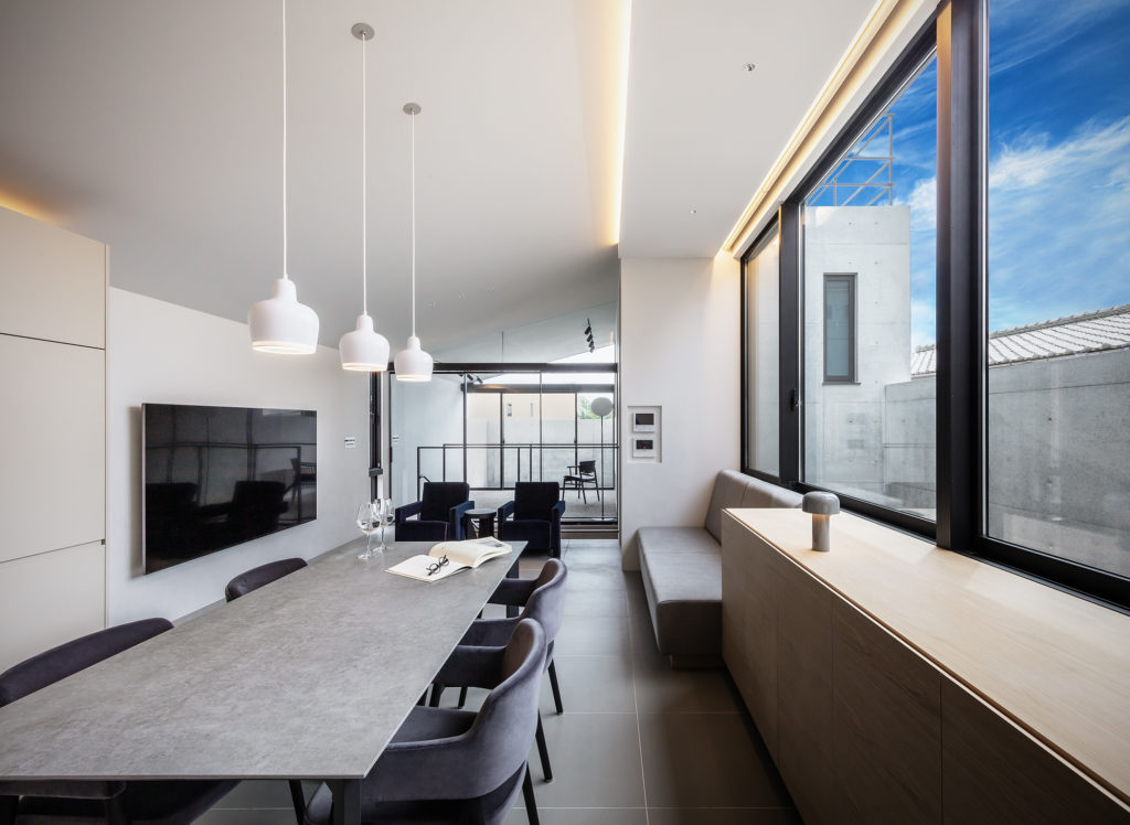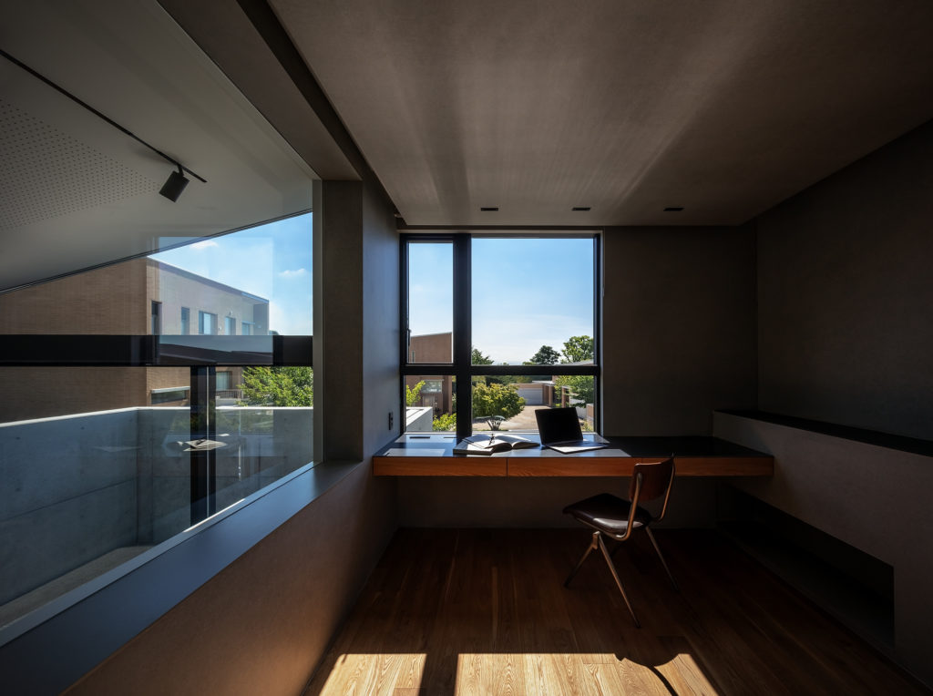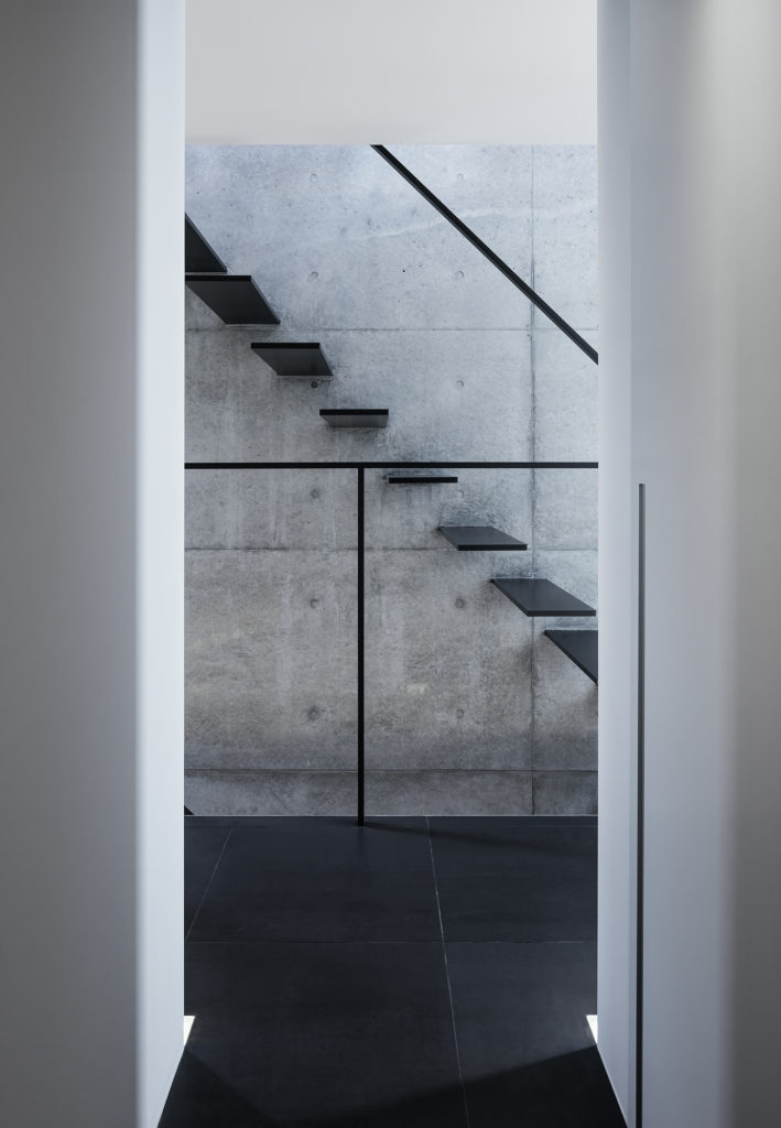 黒い鉄骨の片持ち階段。 打放しコンクリートの壁に、まるで浮遊するかのように現れます。 構造をできる限り削ぎ落とし、線の細さと影のグラデーションで空間の密度をコントロール。 「階段」という機能を、美として再構築した瞬間です。 無音のような静けさの中に、素材と光が語る豊かさがあります。